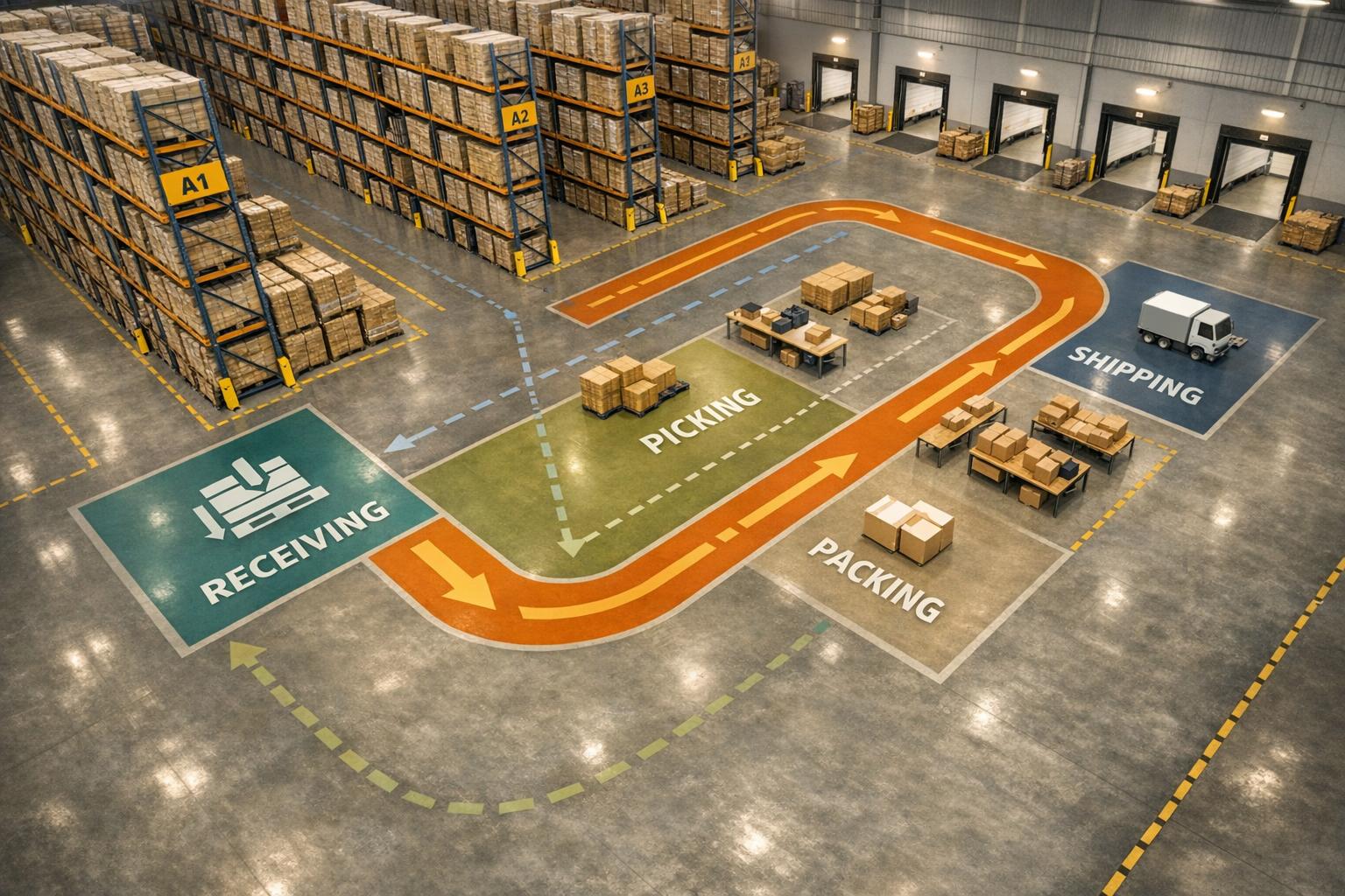 Steps to design efficient warehouse zones, aisles, and layouts (U, I, L, zone-based) to boost speed, safety, and scalability.